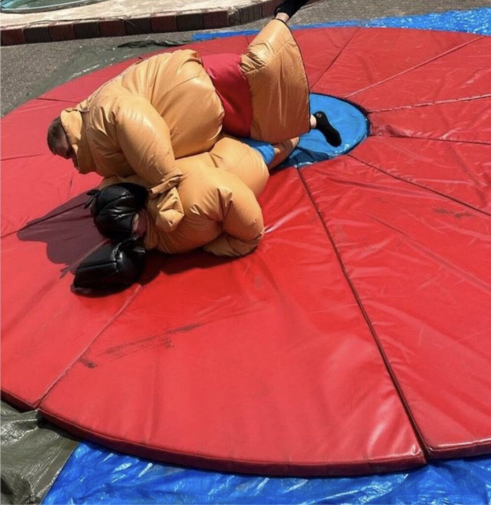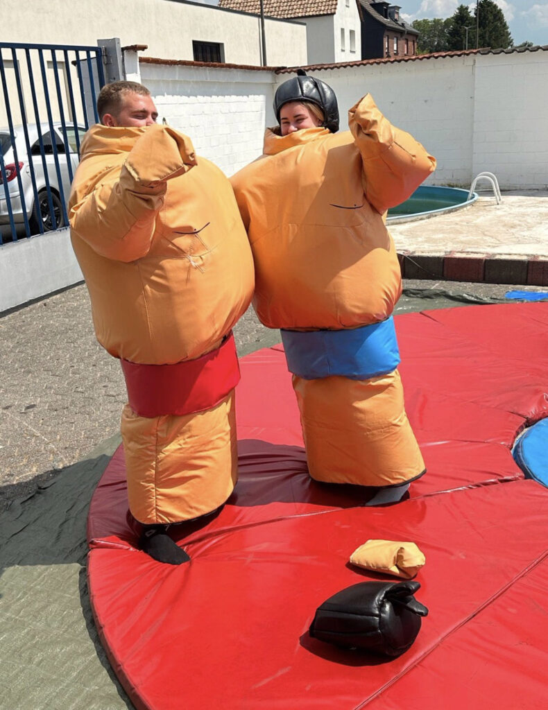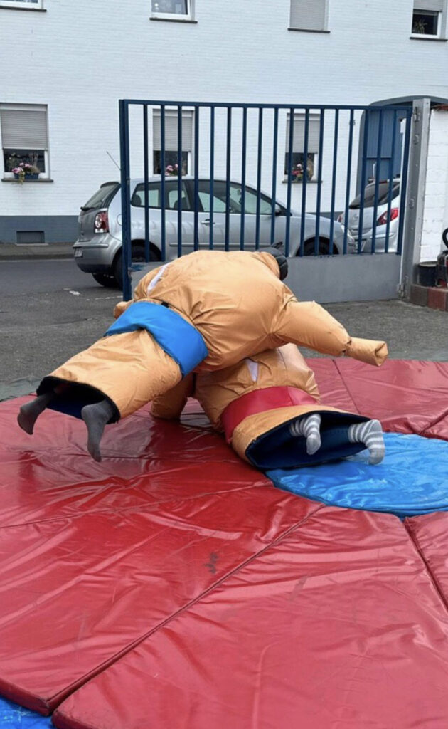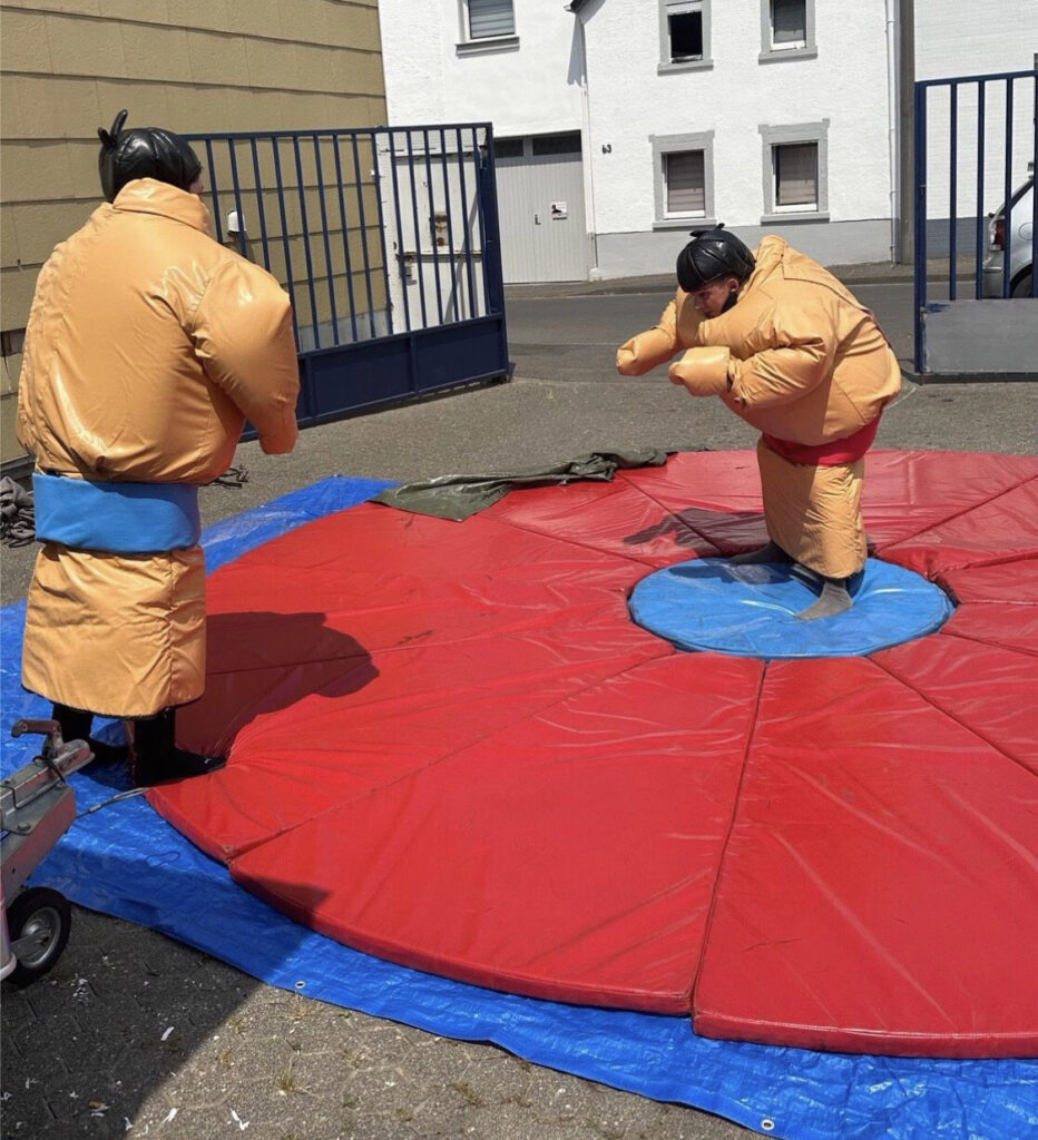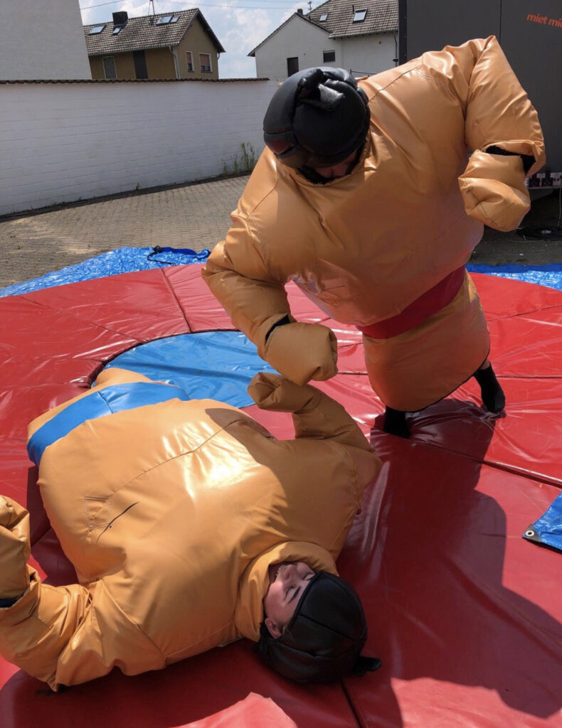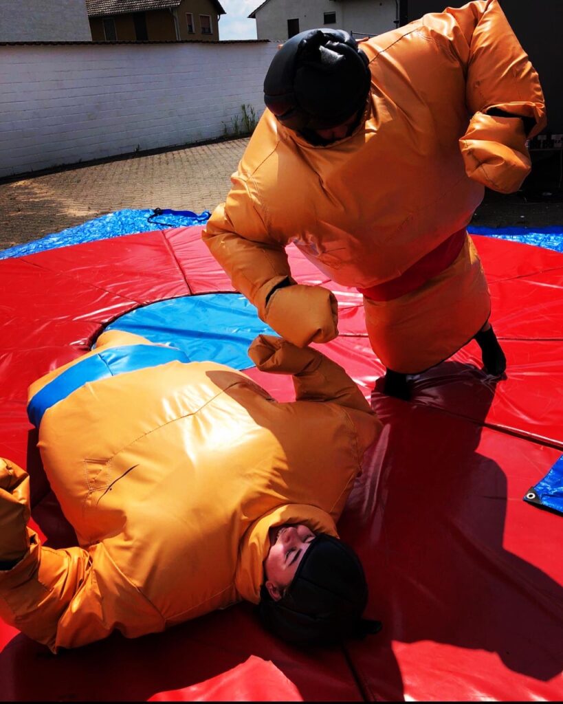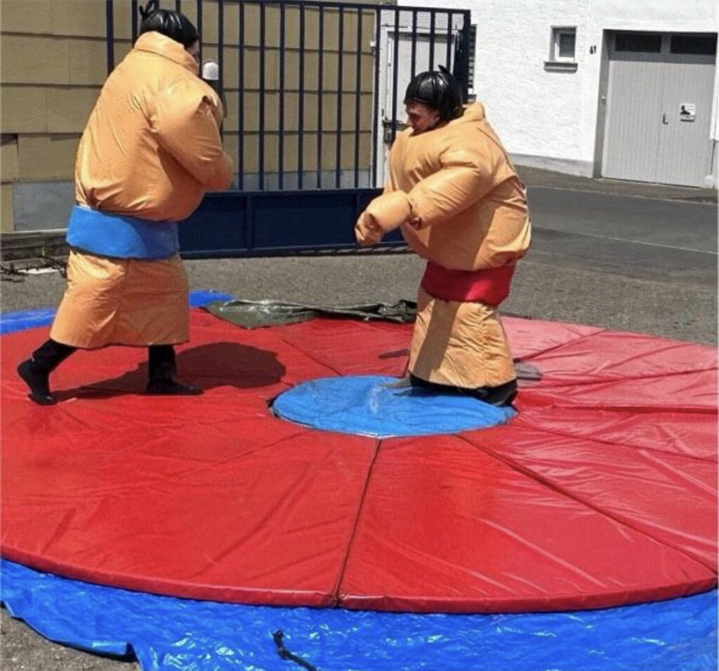 Ihr bekommt zwei hochwertige Sumo-Kostüme inklusive Helme und Handschuhe sowie eine große